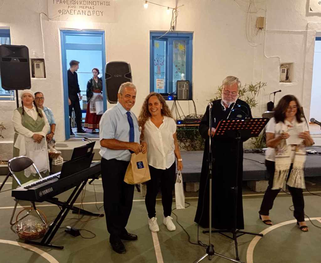 Η Παναγιώτα Μαρινάκη, ως βασικός πυλώνας της επιτυχούς ολοκλήρωσης των εκδηλώσεων του Ανταμώματος, υπογράμμισε μεταξύ άλλων: «Οφείλω ένα μεγάλο δημόσιο ευχαριστώ στον Δήμο Φολεγάνδρου και προσωπικά στον Δήμαρχο Κυριάκο Μαρινάκη, για την παραχώρηση του Δημοτικού Σχολείου, που μας φιλοξενεί απόψε, καθώς και στο συνεργείο Μυκονιάτες Ε.Ε. για ό,τι αφορά στο στήσιμο των υποδομών του χώρου. Ευχαριστώ, επίσης, τη Χορευτική Ομάδα του Συλλόγου Γυναικών Φολεγάνδρου «Οι Πολυκάνδριες», καθώς και τις Μαρία Ζαχ. Μαρινάκη, Μαργαρώ Ι. Παπαδοπούλου και Κούλα Ζαχ. Μαρινάκη για τους νοστιμότατους μεζέδες. Ιδιαίτερες ευχαριστίες ακόμα στους: Ειρήνη Γεωρ. Μαρινάκη, Μαργαρίτα Γεωρ. Μαρινάκη, Μαρία Κων. Μαρινάκη, Ευαγγελία Βίκ. Καρυστιναίου, Πόπη Νικ. Βενιού, Δημήτρη Ι. Παπαδόπουλο, Λευτέρη Γαβαλά και στους καλλιτέχνες μας Γιώργο Ελ. Μαρινάκη, Θανάση Νικ. Άγα και Σταυρούλα Δαλιάνη. Και βέβαια, όλοι μαζί, ευχαριστούμε τον παπά-Παναγιώτη γι’ αυτό το κάλεσμα!»