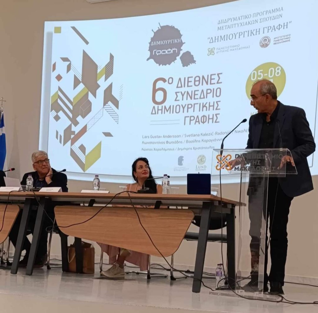 Τo 6o Διεθνές Συνέδριο Δημιουργικής Γραφής, στην Κοζάνη, με τους εξαιρετικούς Επιστήμονες – ομιλητές του, τις υψηλού επιπέδου εισηγήσεις και συζητήσεις, αλλά και την άψογη οργάνωσή του, αποτελεί μία ακόμα λαμπρή σελίδα στην ιστορία της εμβληματικής αυτής διοργάνωσης. Το Κοινό Διαπανεπιστημιακό Μεταπτυχιακό Πρόγραμμα Σπουδών «Δημιουργική Γραφή» (ΠΤΝ/ΠΔΜ*– Τμήμα Κινηματογράφου/Αριστοτέλειο Πανεπιστήμιο Θεσσαλονίκης) σε συνεργασία με το Διιδρυματικό – Διατμηματικό Πρόγραμμα Μεταπτυχιακών Σπουδών «Ρητορική, Επιστήμες του Ανθρώπου και Εκπαίδευση» (ΠΤΔΕ/ΕΚΠΑ* – ΠΤΝ/ΠΔΜ), το Lund University (Centre for Languages and Literature/Modern Greek Studies) και το Παιδαγωγικό Ινστιτούτο Κύπρου του Υπουργείου Παιδείας, Αθλητισμού και Νεολαίας της Κύπρου, συνδιοργάνωσαν το άρτιο από πάσης απόψεως 6ο Διεθνές Συνέδριο Δημιουργικής Γραφής, που πραγματοποιήθηκε από την Πέμπτη 5 έως και την Κυριακή 8 Σεπτεμβρίου, στις νέες υπερσύγχρονες εγκαταστάσεις του Πανεπιστημίου της Δυτικής Μακεδονίας Π.Δ.Μ. (Campus Κοζάνης), στην πόλη της Κοζάνης. Το Συνέδριο τελούσε υπό την αιγίδα της Περιφέρειας Δυτικής Μακεδονίας, ενώ οι εκδηλώσεις για τον Ποντιακό Ελληνισμό υπό την αιγίδα του ιστορικού Σωματείου της «Μέριμνας Ποντίων Κυριών» Θεσσαλονίκης, του Συλλόγου Ποντίων Νυρεμβέργης και του Εκδοτικού Οίκου Αδελφών Κυριακίδη.