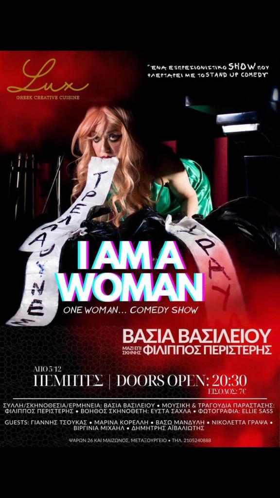 Τι σημαίνει να είσαι γυναίκα του σήμερα; Η Βάσια Βασιλείου παρουσιάζει ένα εξπρεσιονιστικό -στα όρια του stand up comedy– show, γεμάτο από τις καθημερινές οδύσσειες που καλείται να αντιμετωπίσει η σύγχρονη γυναίκα, σε έναν πλαστικό κόσμο που δεν της επιτρέπει να μεγαλώσει ή να μην είναι τέλεια. Από την Τετάρτη 4 Δεκεμβρίου στον πολυχώρο Lux Athens. Τη συνοδεύει ζωντανά στο πιάνο ο μουσικοσυνθέτης Φίλιππος Περιστέρης.