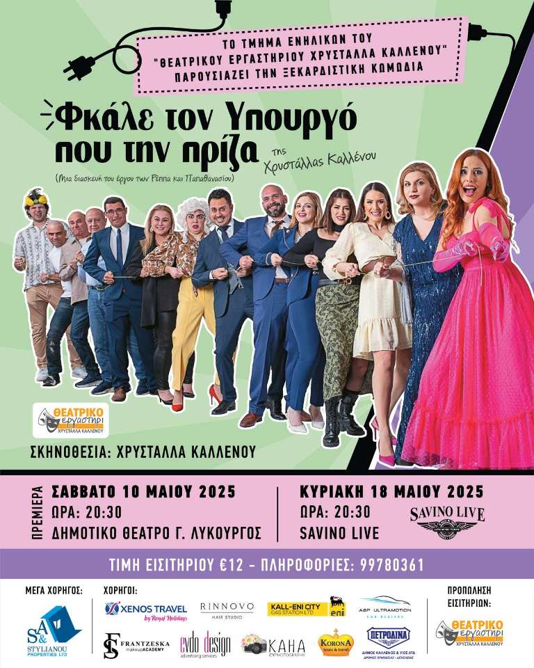 -H παράσταση “Φκάλε τον Υπουργό που την πρίζα” θα κάνει πρεμιέρα το Σάββατο 10 Μαΐου, στο Δημοτικό Θέατρο Λάρνακας «Γεώργιος Λυκούργος», στις 20:30.